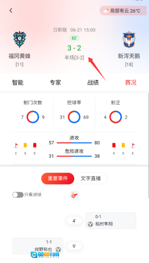2、在比赛详情页面可查看实时数据与技术统计,重要赛事动态会推送即时通知,还支持同时追踪多场比赛。