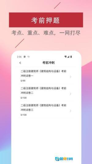 2、真题练习版块,这里汇聚了历年二级注册建筑师考试的真题资源,能助力用户熟悉考试的具体形式,提升应对考试的实际能力,进而增强备考的自信心。