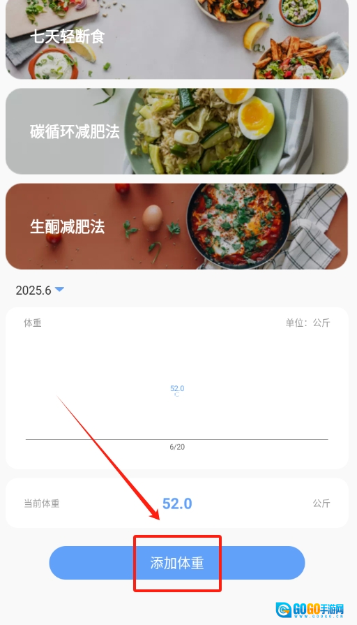 2、进入体重日记页面后,找到 “添加体重” 按钮,点击一下准备记录。
