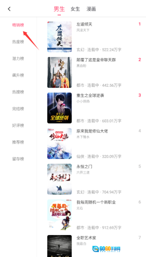 进入小小追书漫画后,在首页的导航栏里找到并点击“畅销榜单”这个栏目,该栏目呈现的是当下热度最高的小说作品。