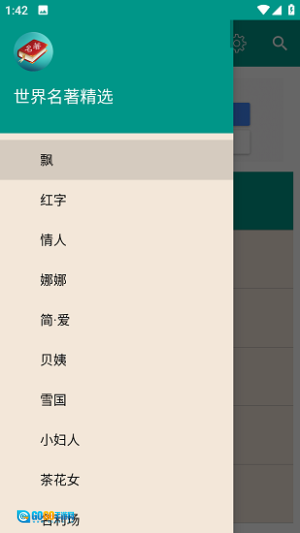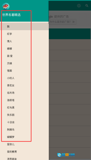 启动世界名著精选应用后,点击界面左上角的目录图标,即可展开完整的书籍分类列表。