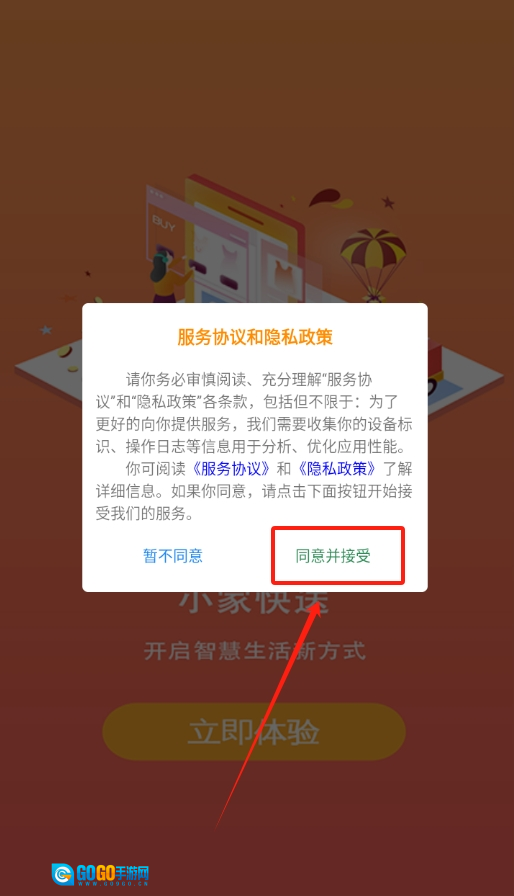 1、打开小家快送跑腿软件后,首先会弹出软件协议页面,点击同意即可进入下一步操作。