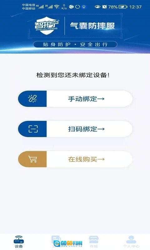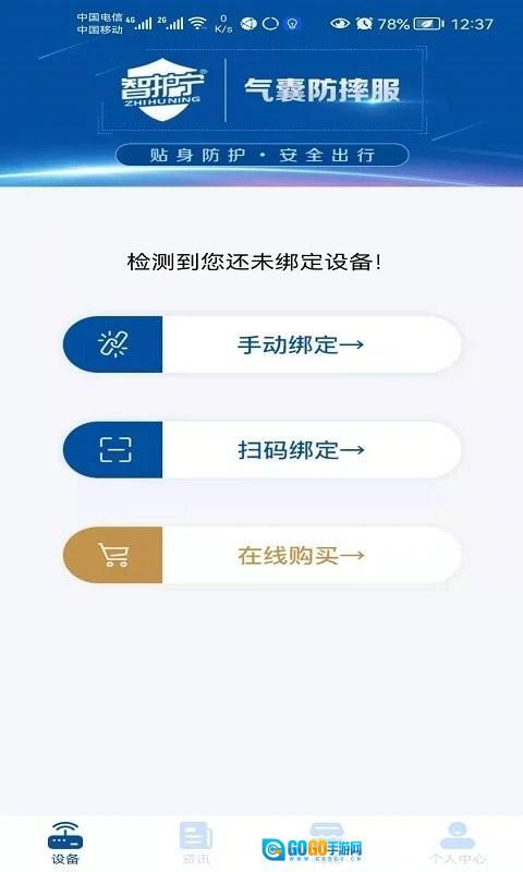 2、扫码绑定智能防护设备的流程:打开软件后,可通过扫码或者设置流程来完成软件与智能气囊防护腰带的连接操作。