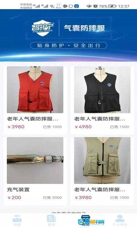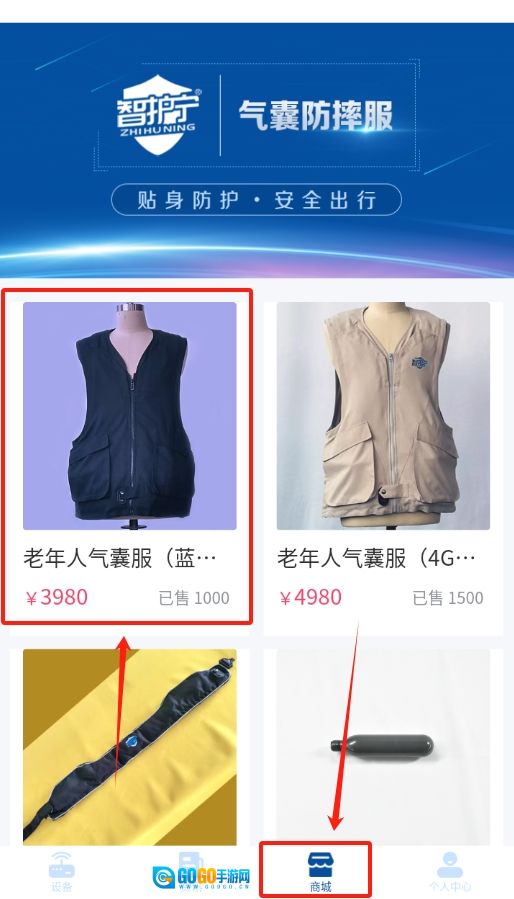 1、打开智护宁气囊防摔服应用,进入商城页面,从丰富多样的商品中挑选一款自己喜欢的防摔服。