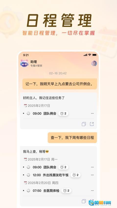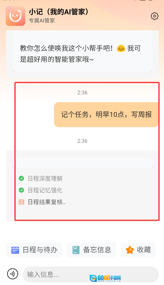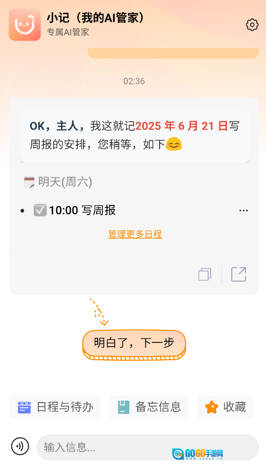 2、对AI说出指令如“明早10点写周报”,系统会自动识别时间、事件类型并生成待办清单。