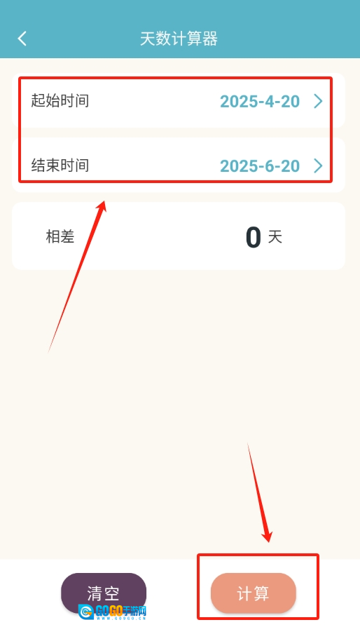 2、进入天数计算器页面后,依据格式规范,先后输入起始时间与结束时间,接着点击下方的“计算”按钮。