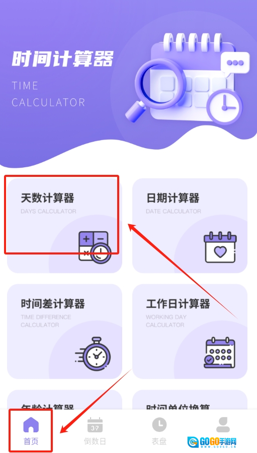 1、打开夏时时间加速倒数日记录应用,在软件首页找到“天数计算器”功能选项,点击该选项进入天数计算页面。