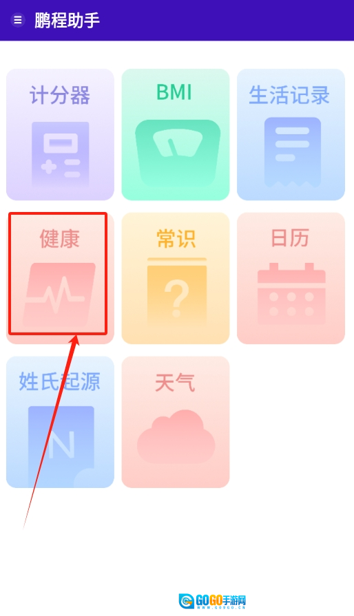 1、启动鹏程助手软件后,首先看到的是琳琅满目的功能选项,从中找到“健康”板块并点击进入。