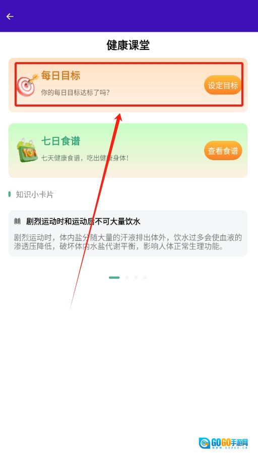 2、进入“健康”页面后,在众多选项中找到并点击“每日目标”选项,以便进行个人目标的设置。