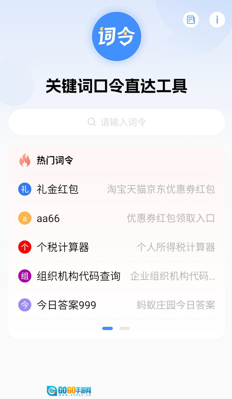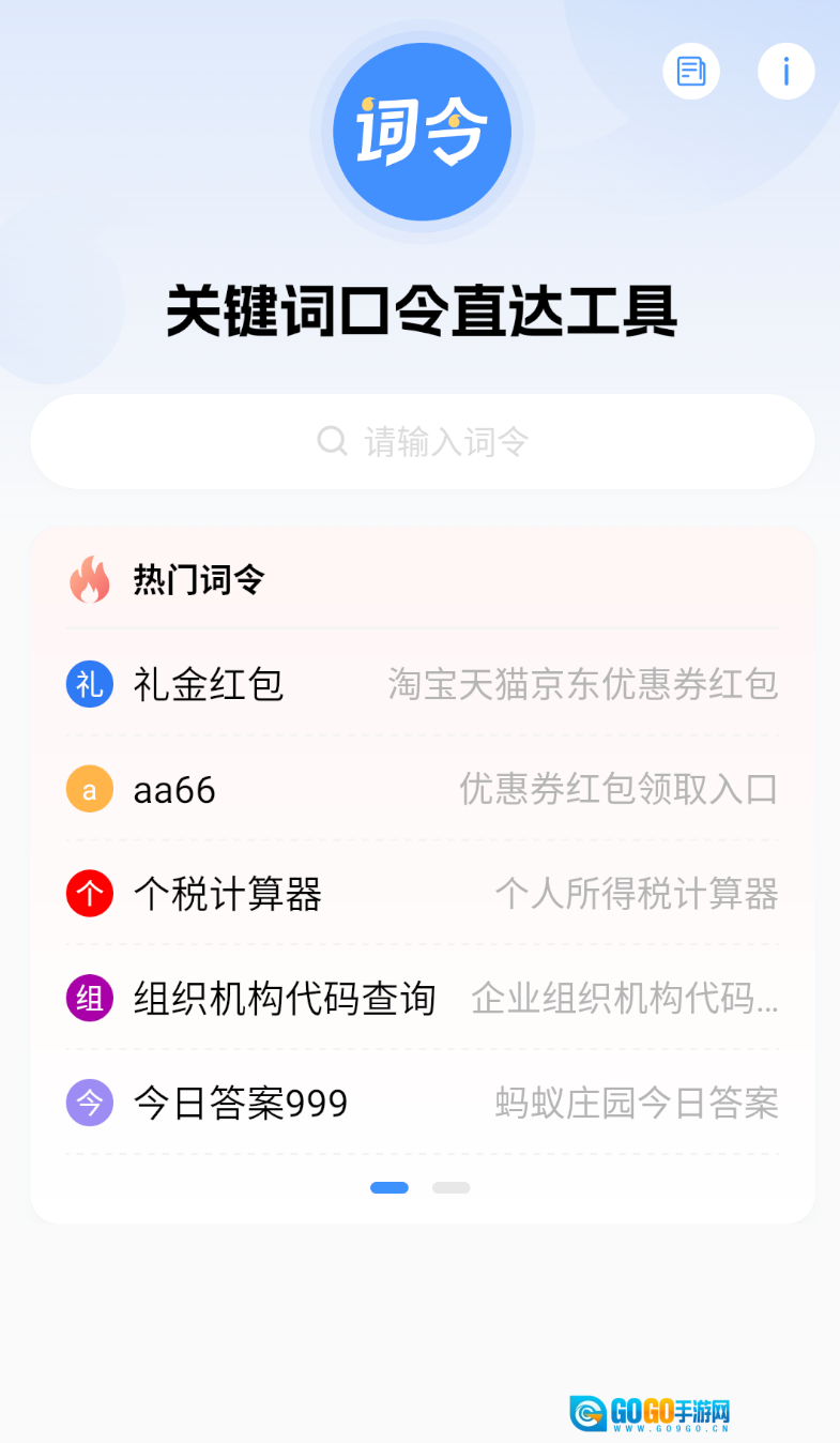 词令是一款关键词口令直达工具,用户打开它后,输入对应的关键词直达口令并进行搜索,就能直接跳转到关联的目标内容。这款工具可以帮助用户通过简单的口令快速访问想要的内容,操作十分便捷,能省去繁琐的搜索步骤,为用户提供高效的直达服务,让关键词口令与目标内容之间的连接变得轻松快速。