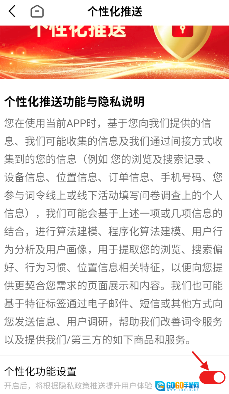 3、向下滑动页面,找到“个性化功能设置”旁边的开关按钮,点击该按钮就能关闭此功能。