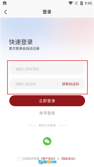 3、进入快速登录界面后,在【请输入手机号码】栏填写号码,获取并输入验证码,勾选相关协议,随后点击【立即登录】按钮。