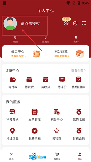 2、进入个人中心后,点击【请点击授权】的区域,就能触发登录流程,这样才能使用会员等相关功能。
