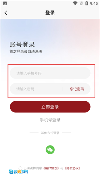 4、切换至【账号登录】界面,输入手机号和密码,若忘记密码可点击【忘记密码】进行找回,随后点击【立即登录】。