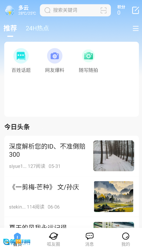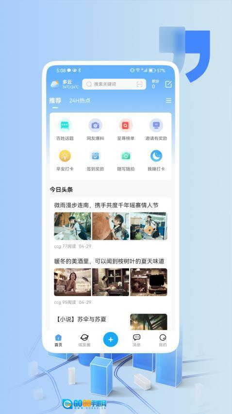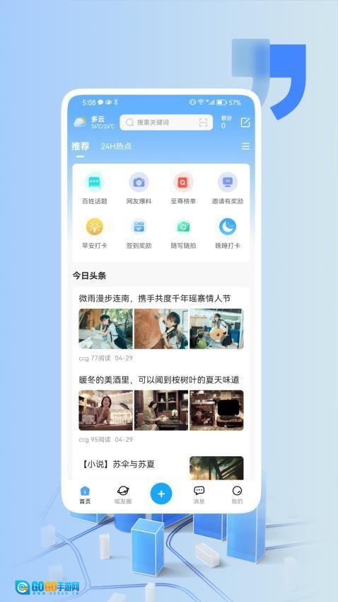1、启动后,首页会推送今日头条和24小时热点资讯,用户可以随时浏览最新本地新闻和热门话题。