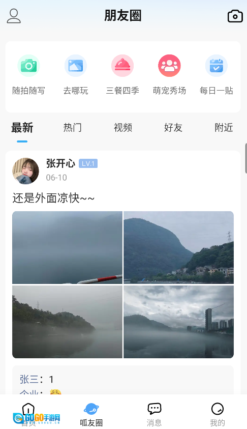 2、进入呱友圈可查看同城用户分享的生活动态,支持评论、点赞互动,还能发布自己的图文动态。