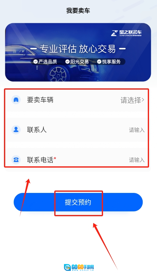 3、成功登录回到首页,找到醒目的 “我要卖车” 选项并点击,接着如实填好车辆、联系人及联系电话,填完点击提交预约。