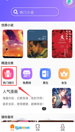 1、启动爱旗小说阅读器后,在首页导航栏选择"热门排行"栏目,这里展示读者最关注的小说作品。