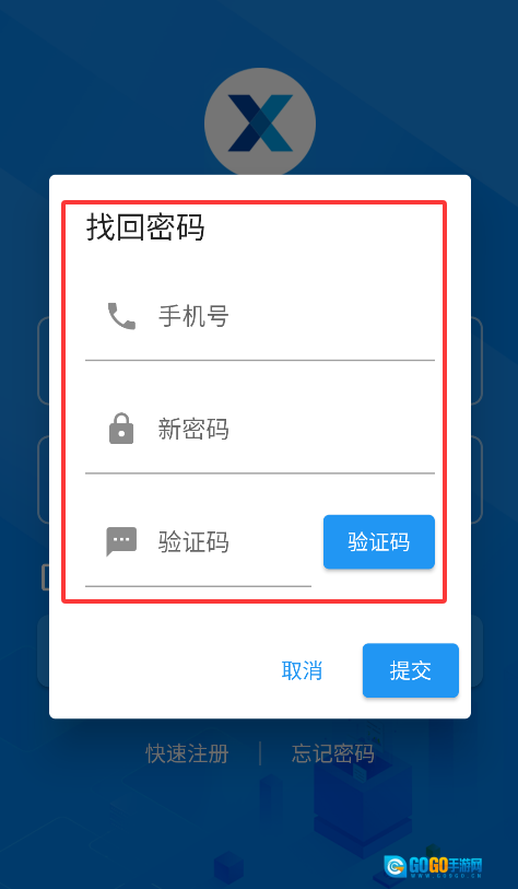 2、输入注册手机号获取验证码,验证身份后设置6-20位新密码(建议字母+数字组合),点击提交完成修改。
