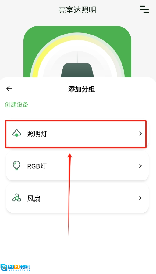 2、加号点开后,会弹出多种设备类型选项,此时您只需在众多选项中,精准选择 “照明灯” 这一类别。