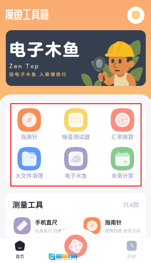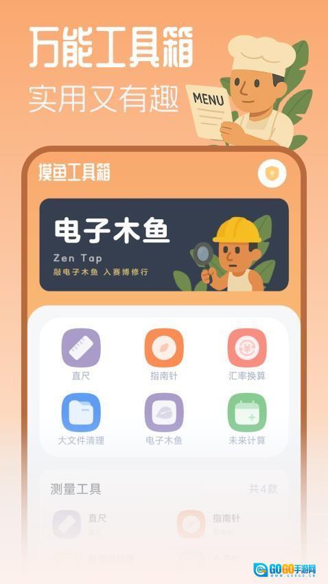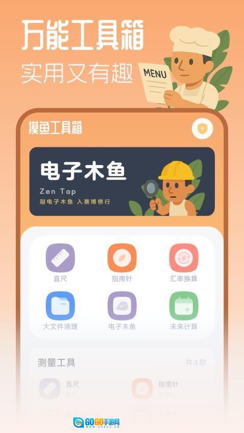 摸鱼工具箱这个工具箱挺有意思的,里面啥小工具都有。电子木鱼敲着解压,尺子、分贝仪这些日常也能用上。汇率换算、文件清理这些功能也挺实用。闲着没事摸个鱼,或者临时要用小工具的,装一个挺方便。操作简单,不占内存。