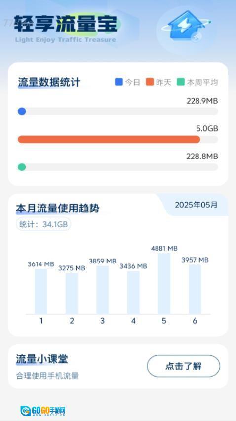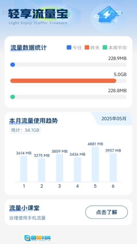 轻享流量宝这个流量监控挺方便的,每天用了多少流量一看就知道。哪个软件费流量也能查,帮你控制手机使用时间。流量快用完还会提醒,不怕超额扣话费。经常担心流量不够的,装一个挺实用。操作简单,统计也准。