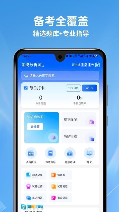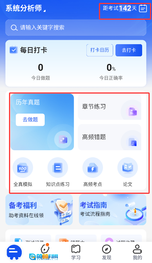2、首页动态显示考试倒计时,提供真题模考、考点专项练习、错题重做等智能刷题功能。