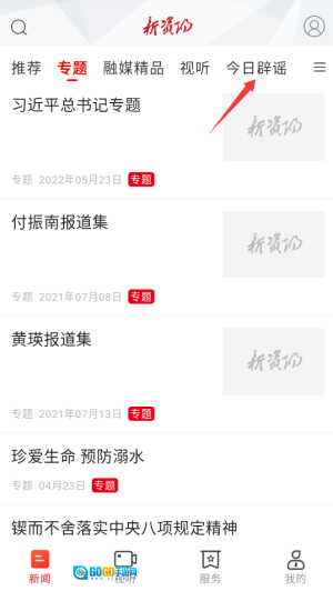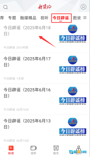 1、进入新资阳后,在首页导航栏选择"今日辟谣"栏目,这里发布权威辟谣信息。