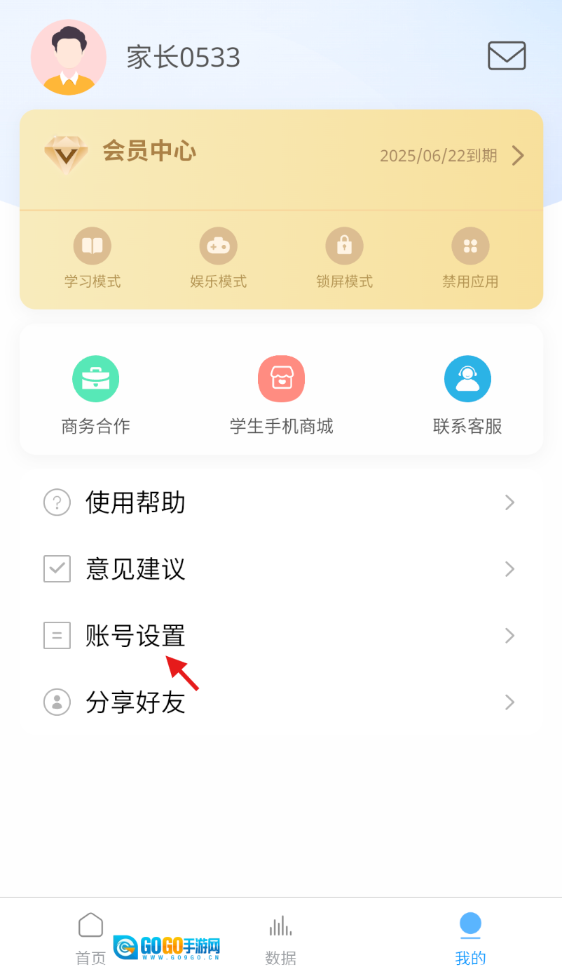 2、进入 “我的” 页面后,找到并点击 “账号设置” 选项。