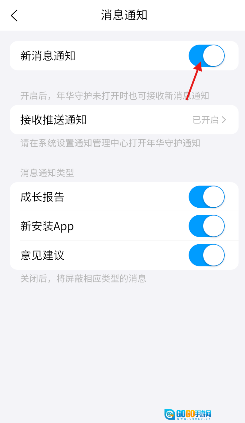 4、在消息通知界面中,点击 “新消息通知” 旁边的开关,将其关闭即可。