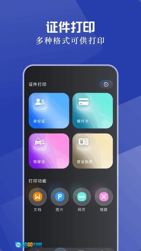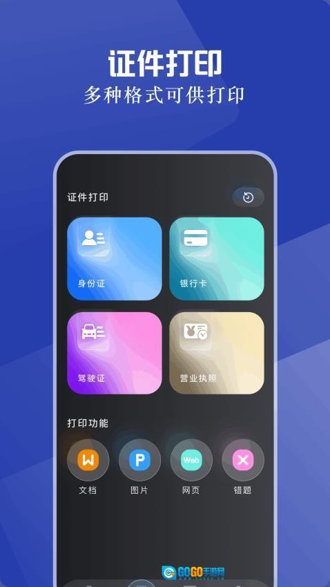 2、选择打印类型(证件/文档/照片),支持身份证复印排版、A4文档无线打印等专业功能。