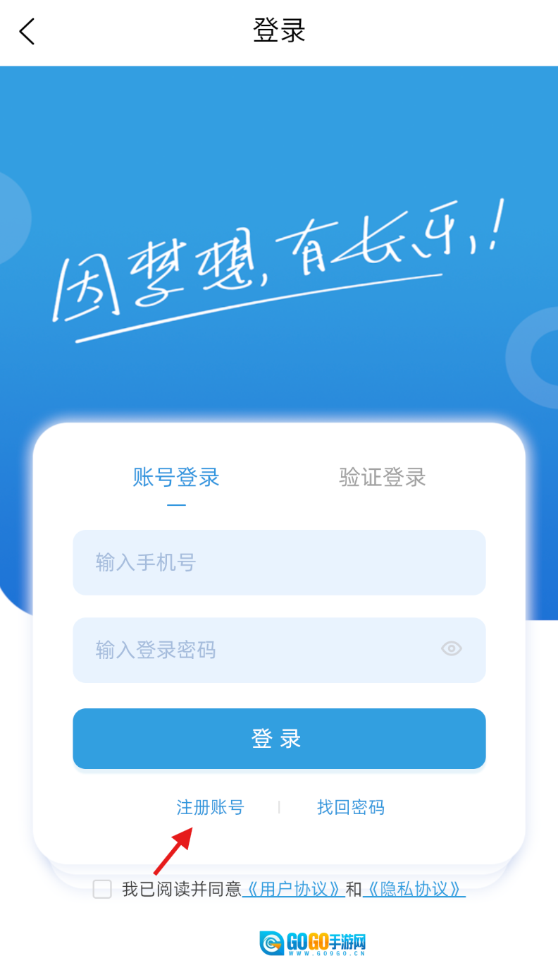 2、稍作等待进入登录页面后,点击页面上的 “注册账号” 按钮,跳转至注册界面。