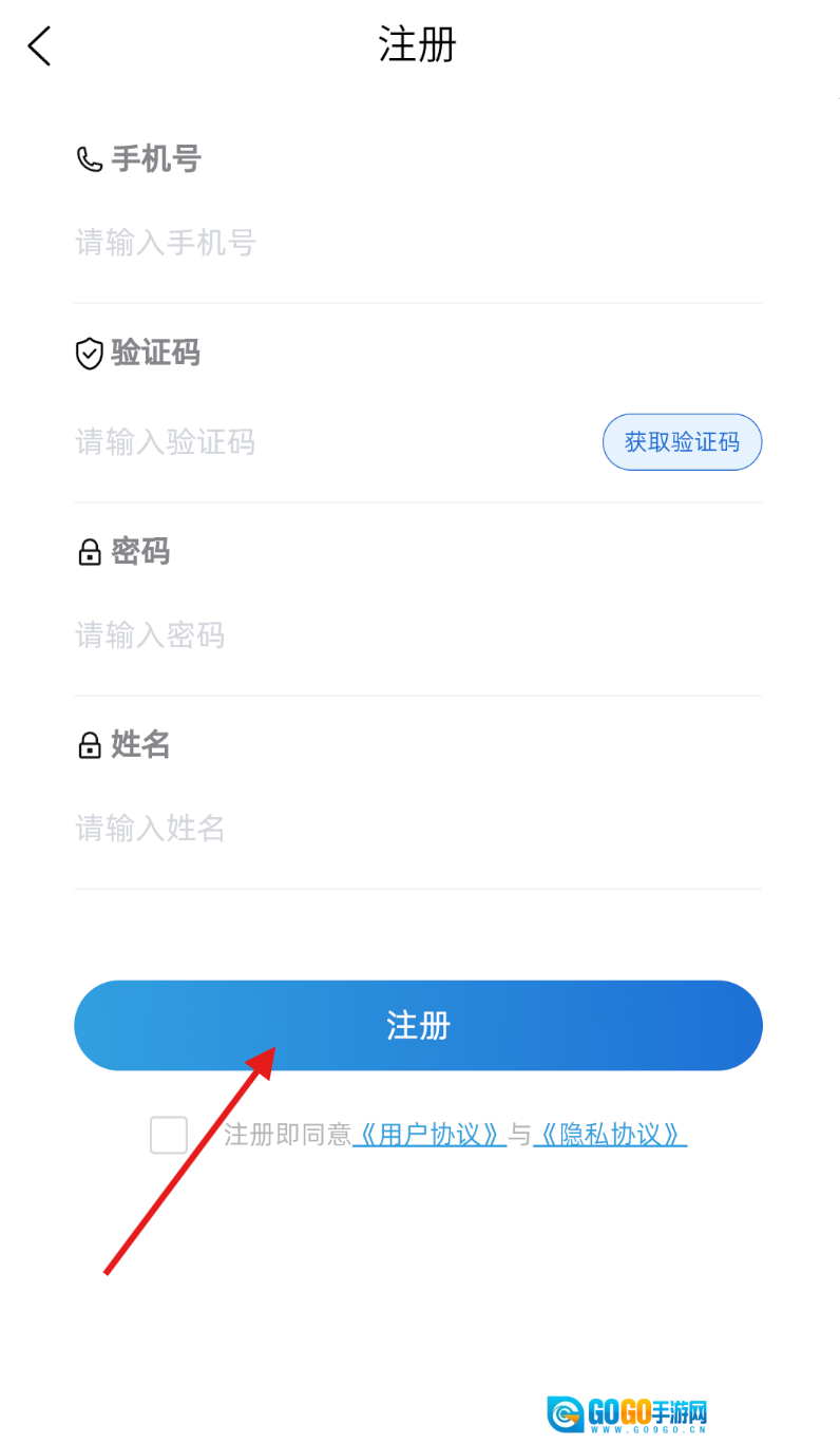 3、在注册界面依次输入手机号、设置密码、填写验证码和真实姓名,最后点击 “注册” 完成操作。