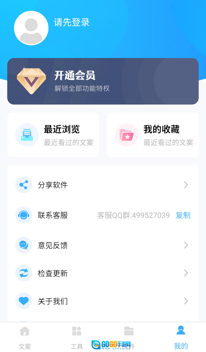 1、首先打开文案君软件,通过 QQ 或微信账号完成登录操作。