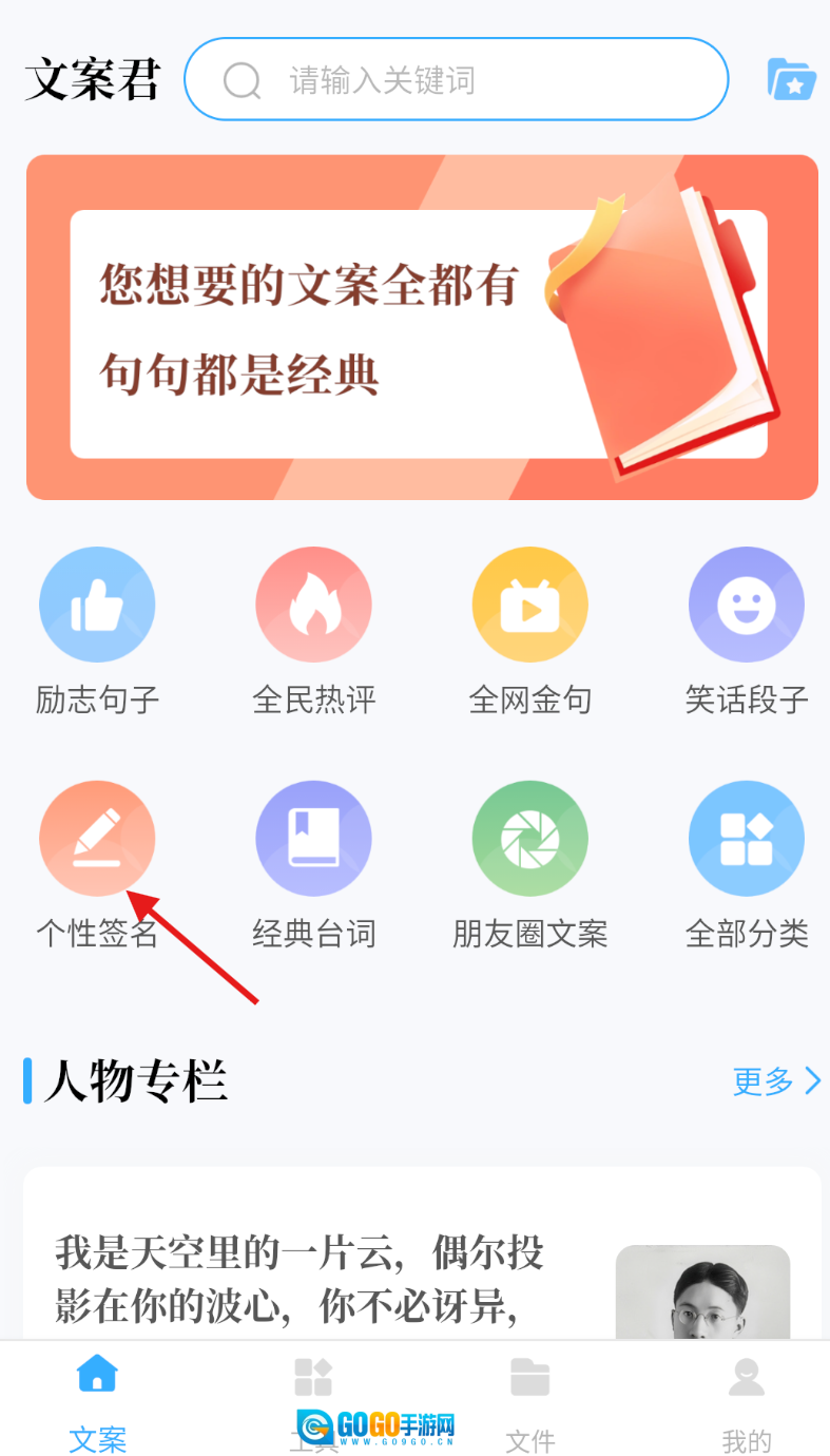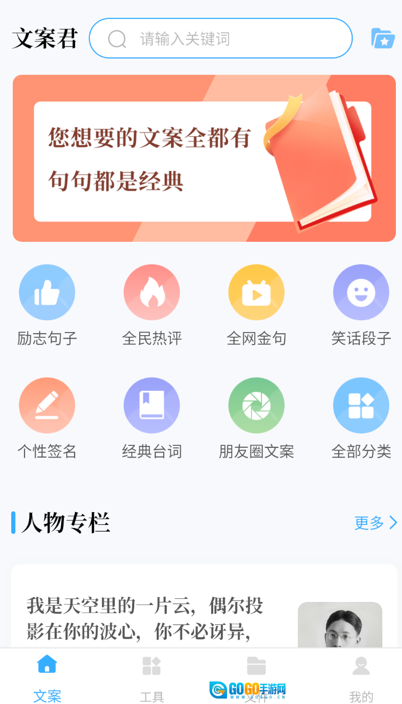 文案君是文案创作的好帮手吗,集结经典台词、励志语句、朋友圈热门文案和全网金句,所有资源免费供应。不管是靠文字打动人心,还是用图片吸引眼球,都有多种类型文案适配不同创作目的与风格。
