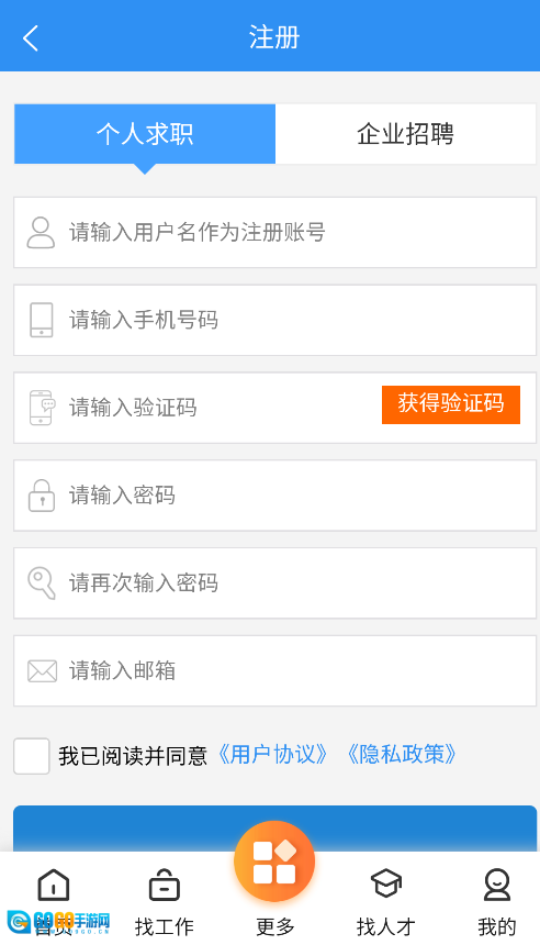 2、根据身份选择"求职者"或"企业HR"注册通道,填写对应的基本信息完成注册。