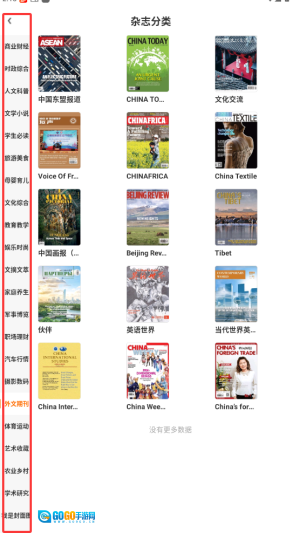 2、在期刊分类里找到“外文期刊”专区,能按照学科领域或者首字母来检索想要找的刊物。
