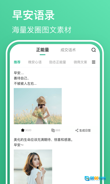 1、该应用收录了数万条经典语录资源,包含励志格言、情感短句、名人名言等十余种类型,每日持续更新热门内容。
