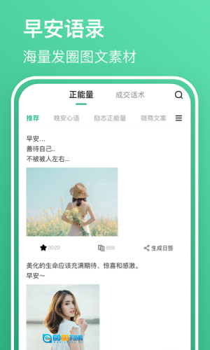 3、独创图文结合模式,每条语录均配有高清背景图片,支持文字与图片一键打包保存,方便制作手机壁纸或社交分享。