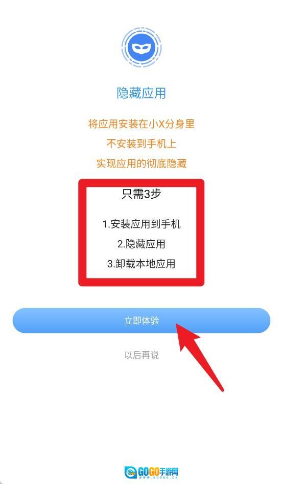 2、点击隐藏应用后,按照提示依次完成三步操作,就能达成应用安装后隐藏,随后卸载原应用的效果。