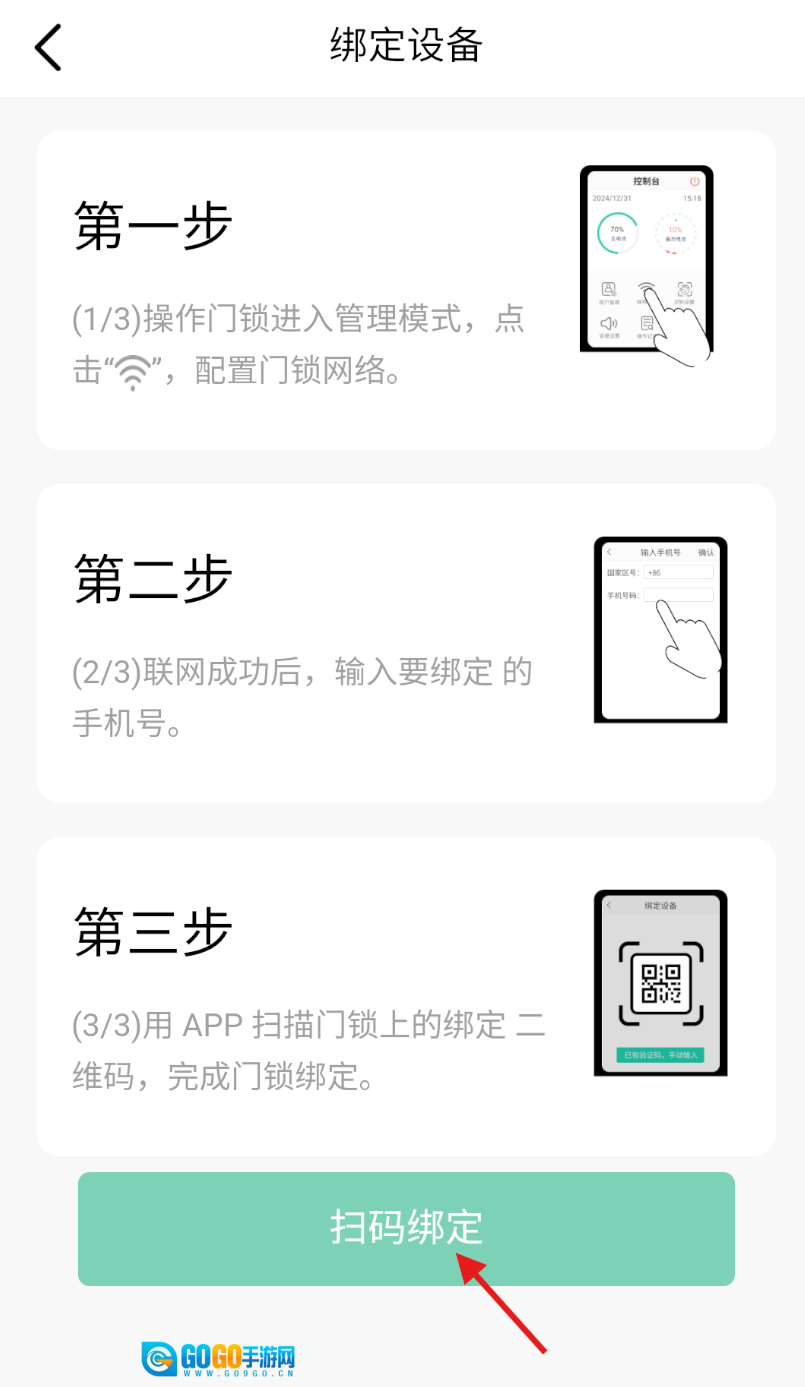 4、依照绑定设备页面展示的三步指引操作,最后通过扫码绑定完成设备连接。