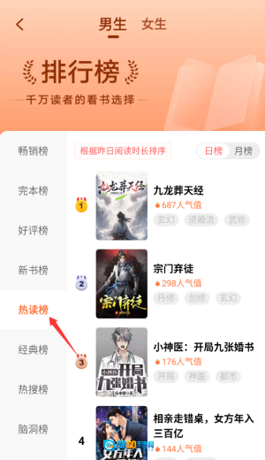 2、在"热读榜"专区浏览时,可通过分类标签或推荐指数筛选,快速找到心仪的小说作品。