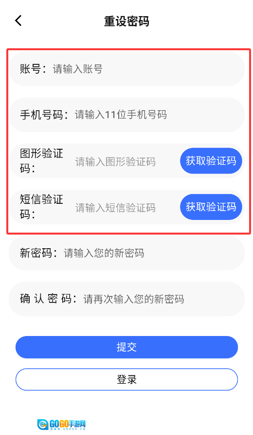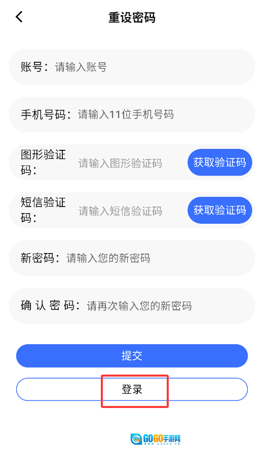 2、输入注册手机号获取验证码,验证身份后设置8-20位包含字母数字的新密码。