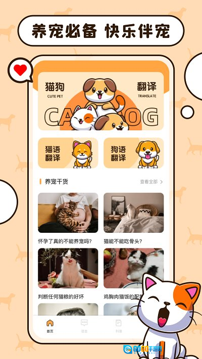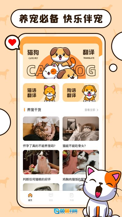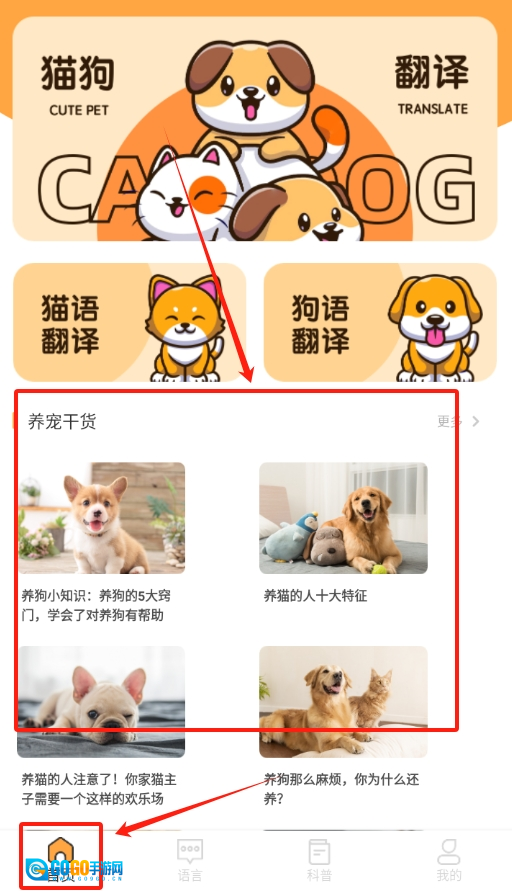 1、打开猫语狗语翻译交流工具,进入首页就能看到 “养宠干货” 板块,满满都是实用知识。