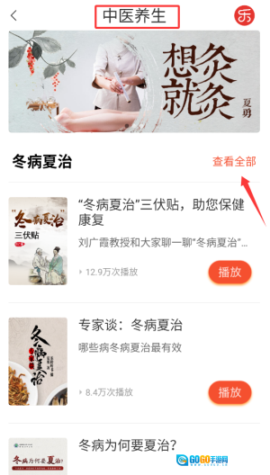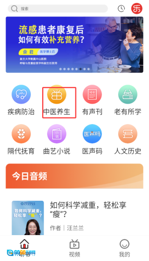 1、启动乐龄听书后,在首页分类栏目中选择"中医养生"频道,这里汇集健康养生类音频内容。