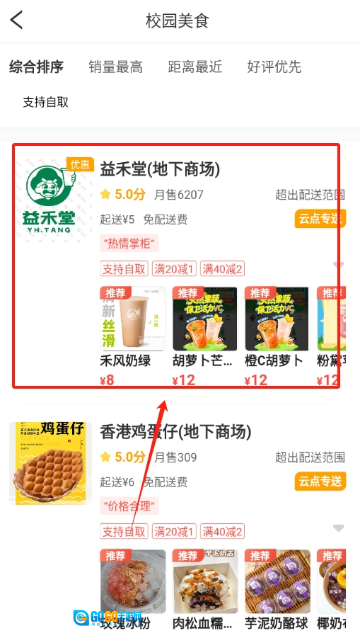 2、进入页面后,从琳琅满目的商家中挑一家想吃的店点进去查看。