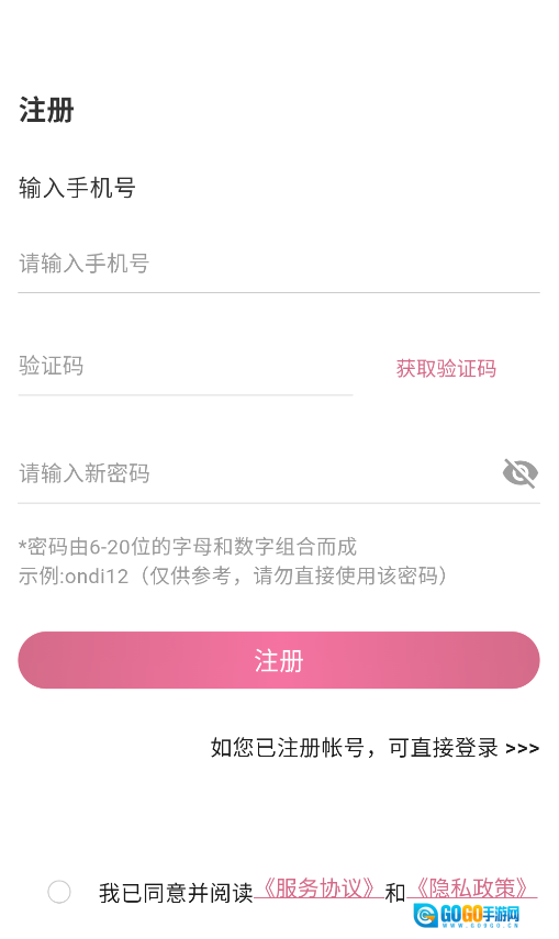 1、启动后,在登录页面点击"去注册"选项,进入账号创建流程。