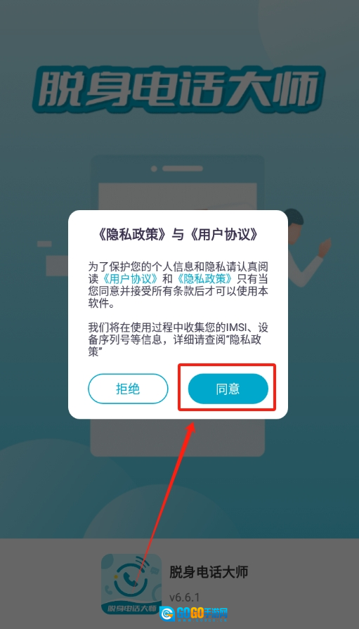 1、首次打开脱身电话大师软件,页面会弹出软件协议,仔细看完后,果断点击同意选项。