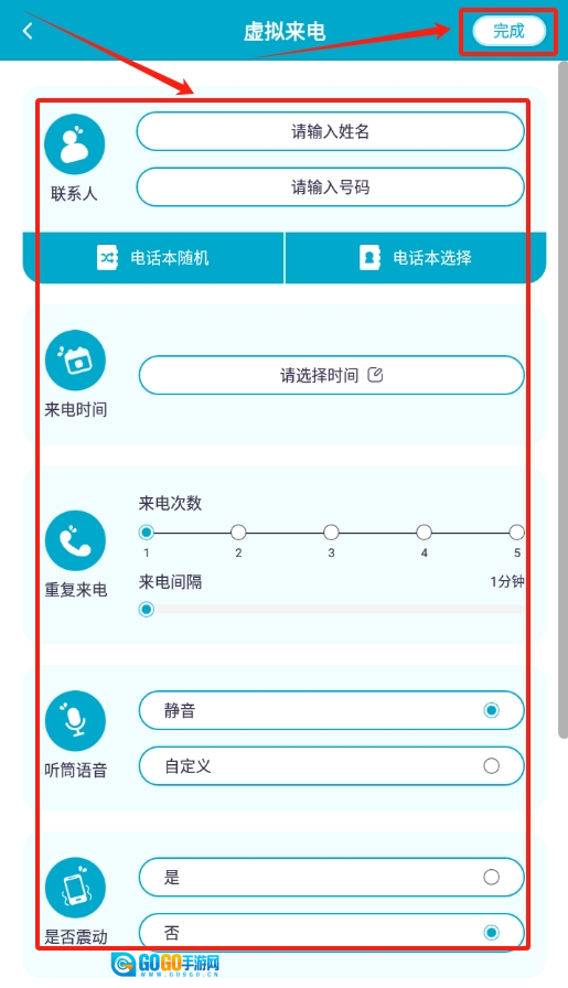 2、进入软件主界面,找到 “虚拟电话” 功能入口点击进入,在对应位置输入来电相关信息,完成后点击右上角 “完成”。