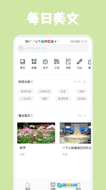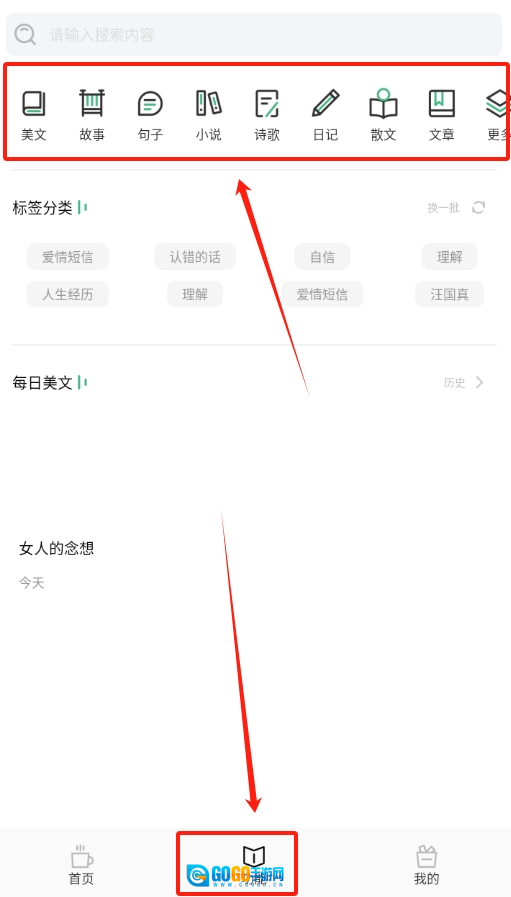 2、首页内容浏览与发现:打开软件在首页浏览推荐的美文和句子,发现自己喜爱的文字内容。
